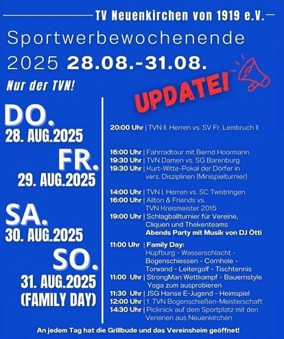 Das finale Programm für unser Sportwochenende steht. Wir freuen uns, euch alle auf dem Sportplatz zu sehen! Blau-weiße Grüße, euer Vorstand